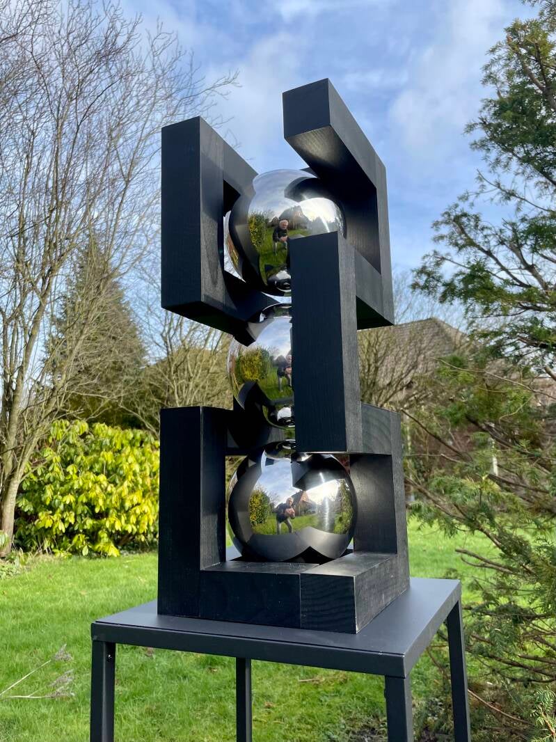 O.T. Edelstahlkugel auf Hartholzkeile 30x40cm 2023